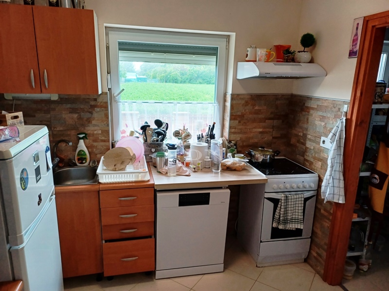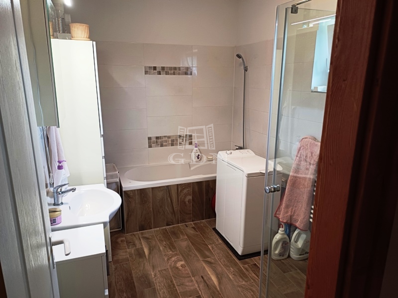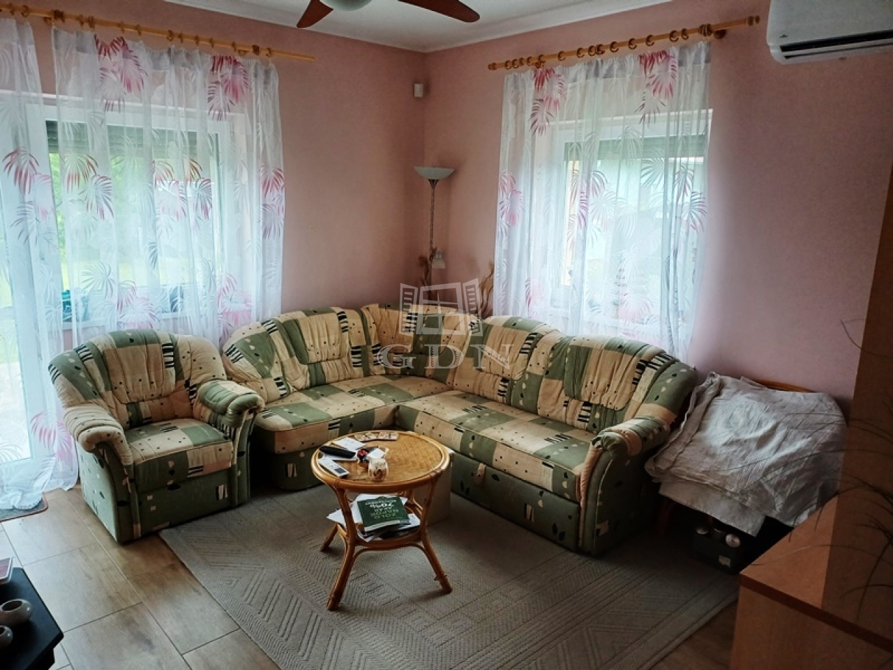 Burkolatai a vizes helyiségekben kerámia lap, a nappaliban és a szobákban laminált parketta.