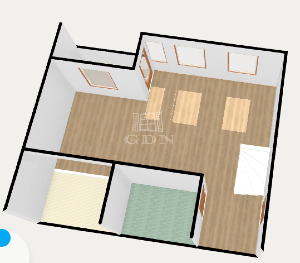 A felső szintre egy kényelmes fokkiosztású lépcsőn juthatunk fel, ahol is a br. 14nm terjedelmű világos előszoba (itt akár külön dolgozó vagy közösségi tér is kialakítható) valamint a 6nm-es kádas duplamosdós fürdő, kettő egyenként br.15,6 és 14nm terjedelmű hálószoba és egy közel 5nm es gardrób került kialakításra.