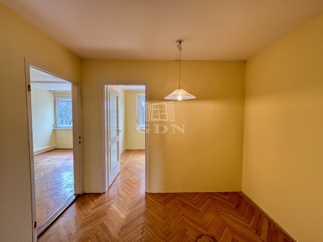 Helyiségei: előszoba, konyha, nappali, kettő szoba, étkező, fürdőszoba, WC.