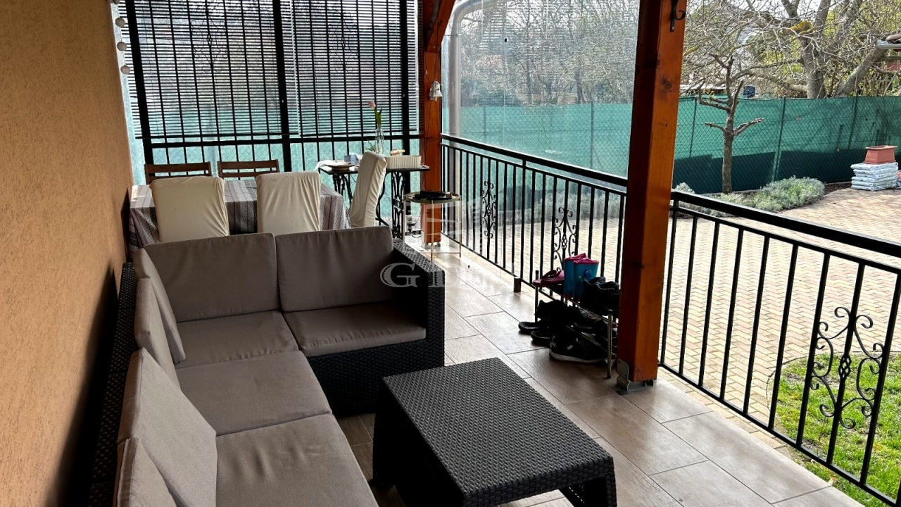 Hátul, a kert felé pedig egy kényelmes méretű, fedett terasz található.
