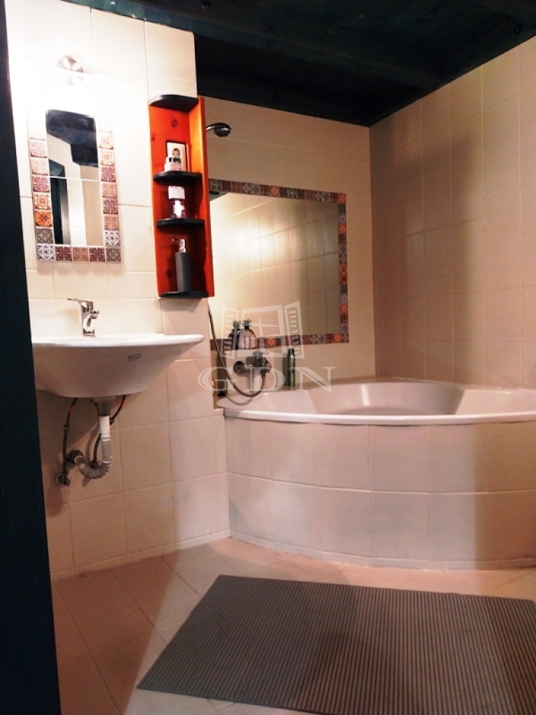 Jobb oldalon találjuk a 3,5 nm-es igazán hangulatos, elegáns ,sarokkádas , egyedi fagerendás megoldású fürdőszobát. Mellette az ablakos külön nyíló mosdót.