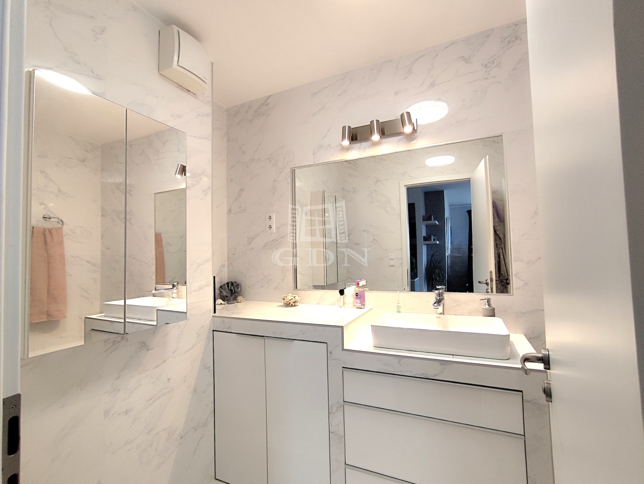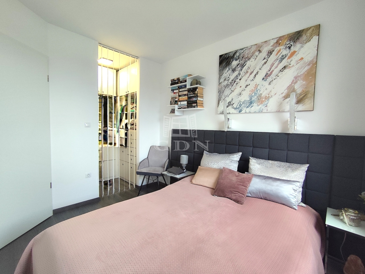 A fő hálóhoz külön gardrób tartozik, mennyezetig beépített bútorokkal.