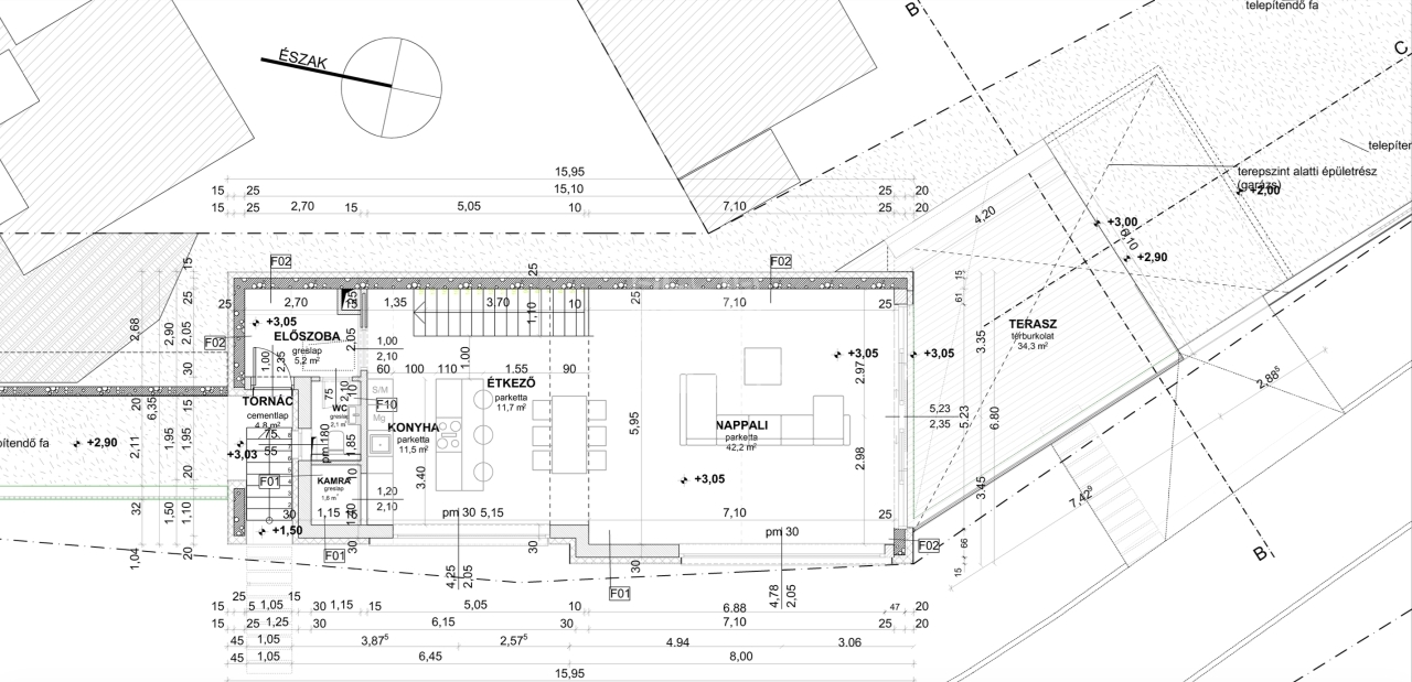 MÉRETEK, TÁJOLÁS, ELRENDEZÉS, AZ ALAPRAJZOKON.