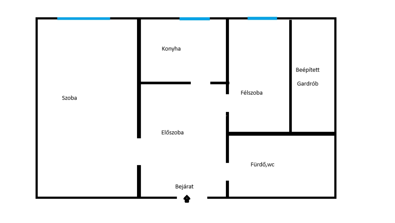 A lakás praktikus elrendezésű: az előtérből nyílik a két különálló szoba, valamint a külön konyha és a fürdőszoba is.