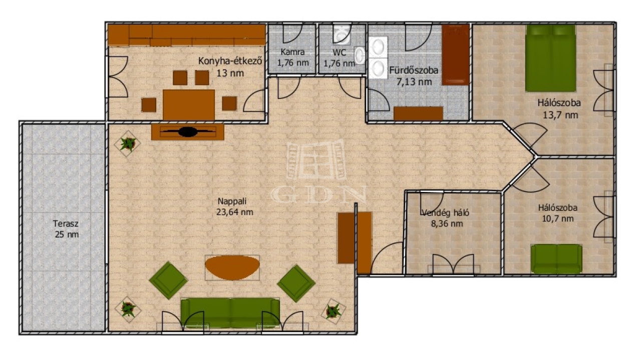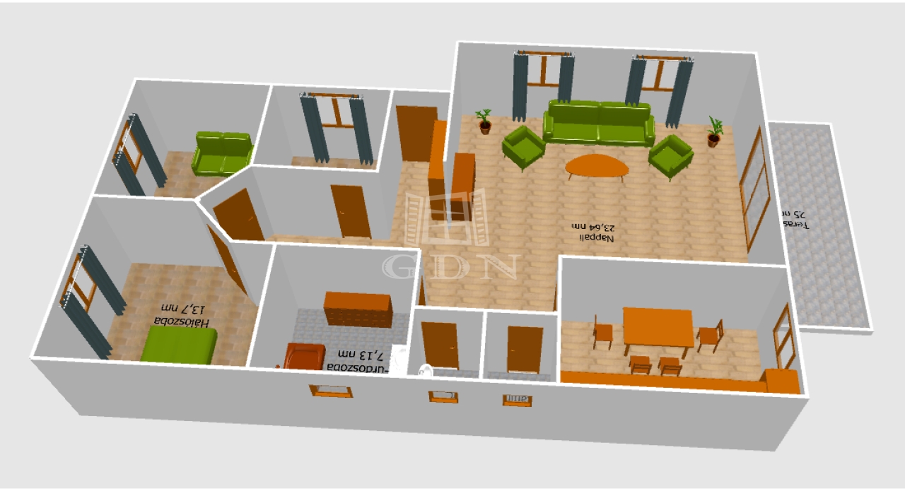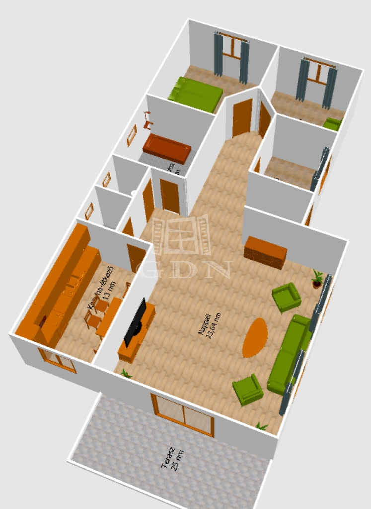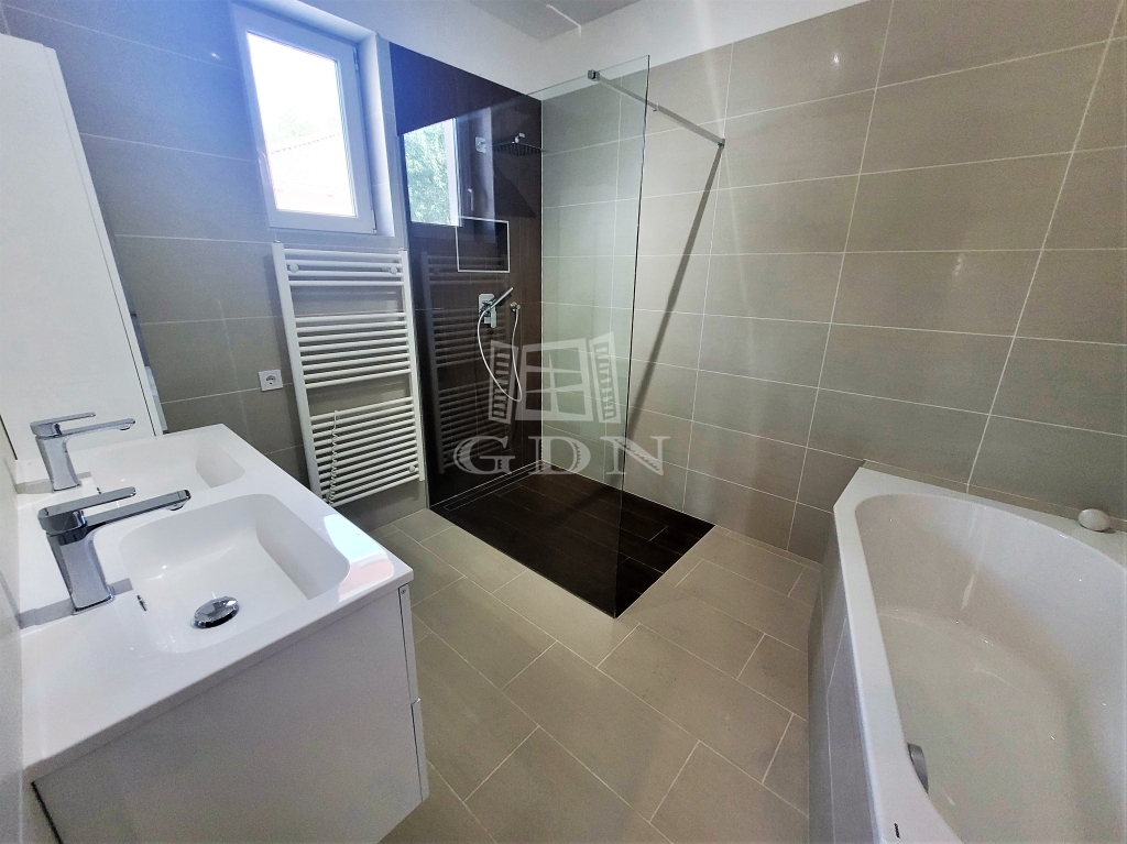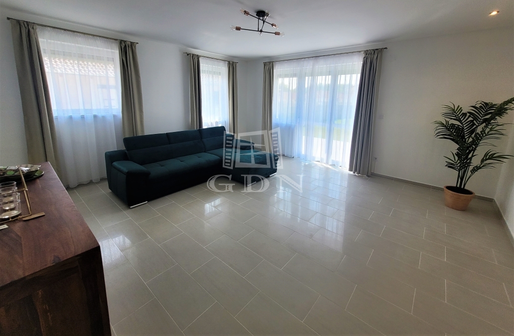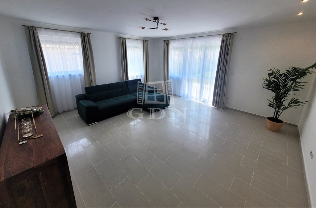 - belső elosztás: nappali, konyha (vadonatúj háztartási gépekkel felszerelt), fürdőszoba, WC, háztartási helyiség, 3 hálószoba, közvetlen kertkapcsolatos nagy terasz,